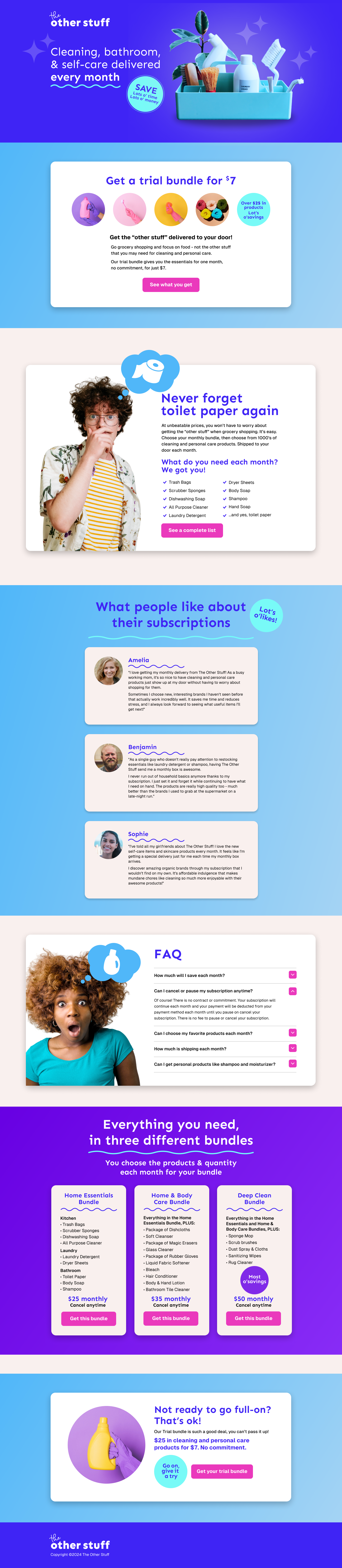 The Other Stuff is a monthly subscription service that provides cleaning and personal products at a lower price. It makes grocery shopping easier for subscribers by delivering “the other stuff” such as laundry detergent, hand soap, and toilet paper every month.